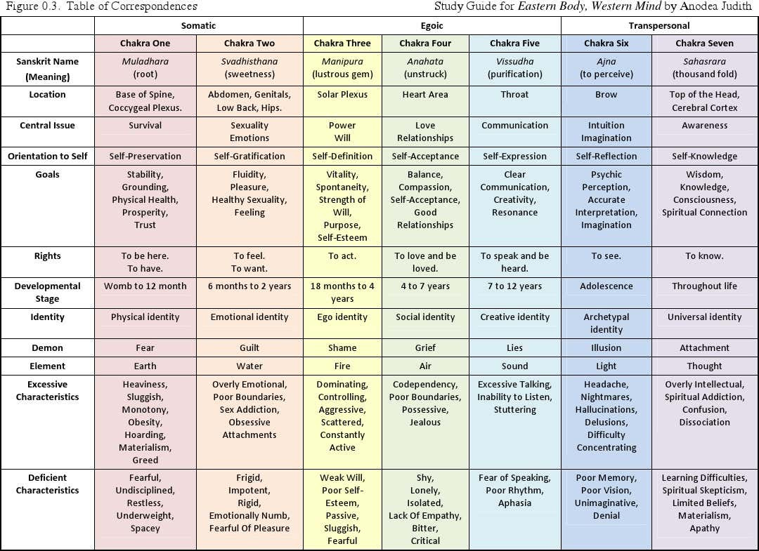 2) Identify the chakra(s) involved using this helpful Table of Correspondences: (Click here if you have trouble viewing it below.)2